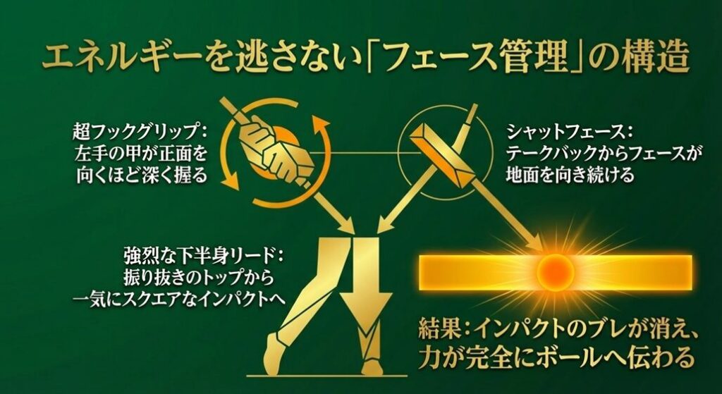 - ドライバーのスイングにおけるシャットフェースと強靭な下半身リード