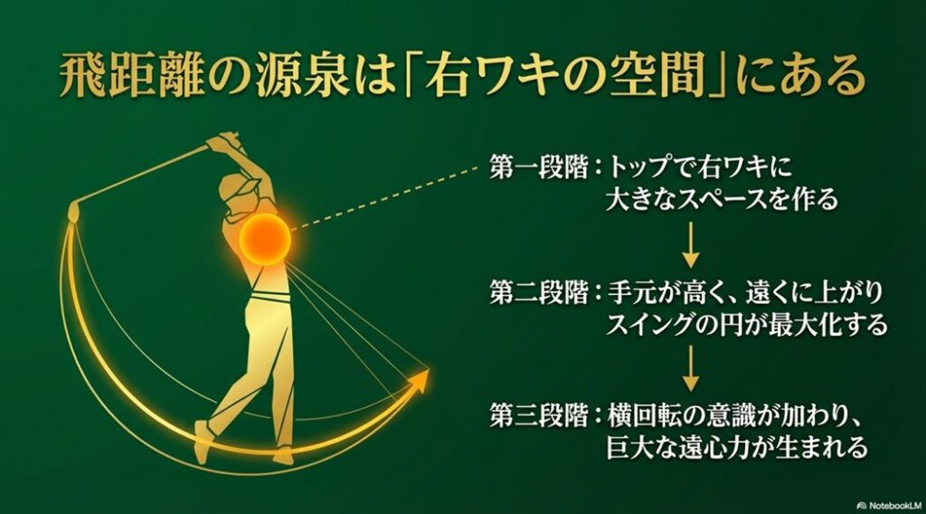 これにより、手元をより高く、そして遠くへ上げることができ、結果としてスイングアーク(クラブが描く円)が最大化されるのです。