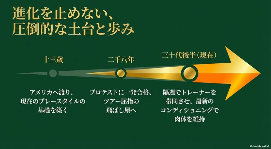 インサイド・アウトの軌道を改善し、左へのミスを減らしてシンプルに攻めるスタイルへと「意識改革」を行ったことが、現在の安定した飛距離に繋がっているようです。