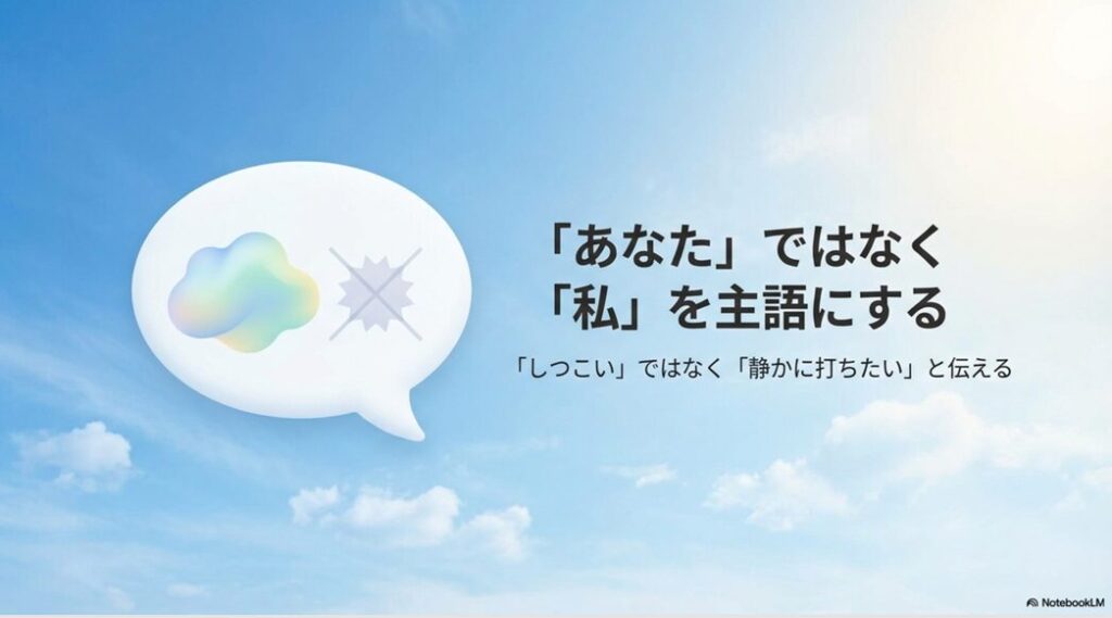 「あなたのアドバイスがしつこい!」と相手を主語にする(YOUメッセージ)のではなく、「私は今、自分のペースで練習したいから、静かに見守ってくれると嬉しいな」と自分の感情を主語にする(Iメッセージ)ことを意識しましょう。