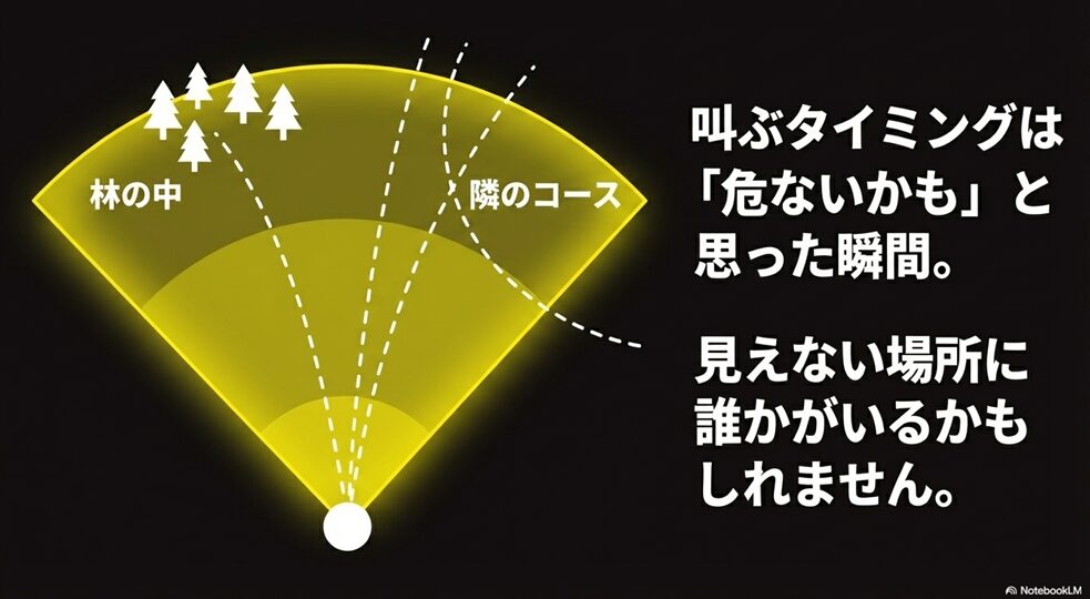 時には林の中や隣のホールなど、視界が悪い場所にボールが飛ぶこともあるため、「誰かがいるかもしれない」と感じた時点で叫ぶことが重要です。
