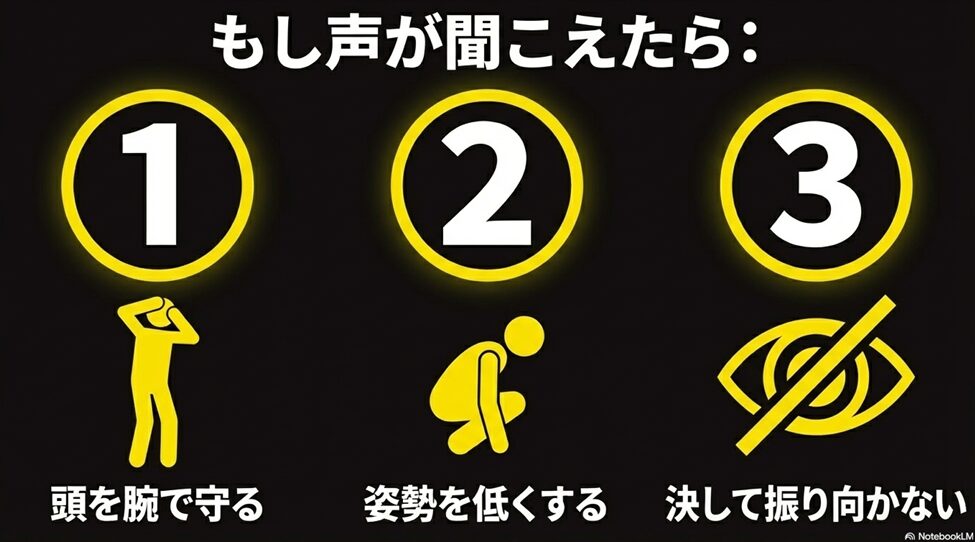 • 聞こえた側はすぐに頭を守り、姿勢を低くするべきである