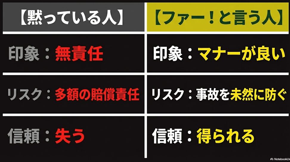 正しいマナーとして「ファー!」をしっかり使うことが、結果的に自分と他人の安全を守る一番の手段となります。