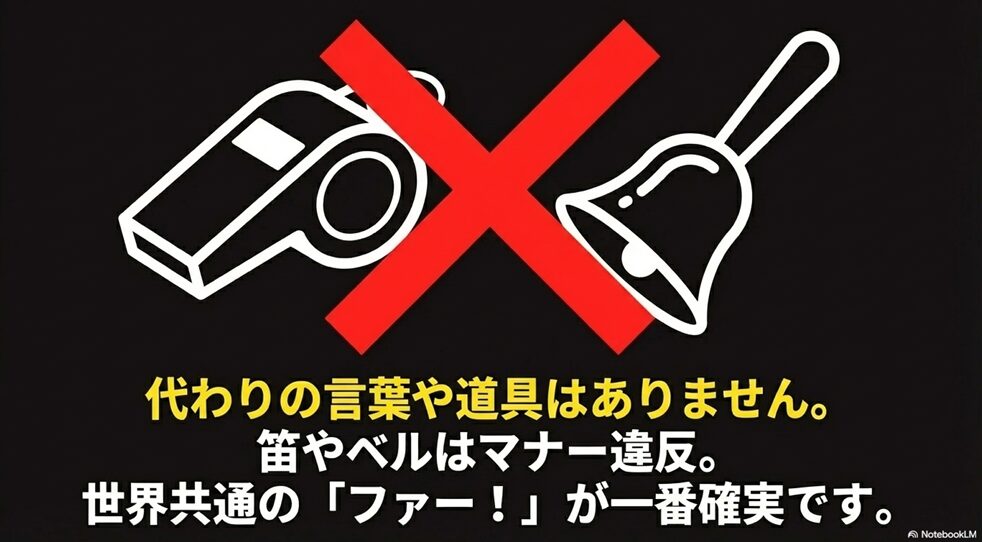 このように、現場で瞬時に危険を知らせるには「ファー!」の一言が最も浸透しており、代替手段として他の方法を取るのは避けるべきです。
