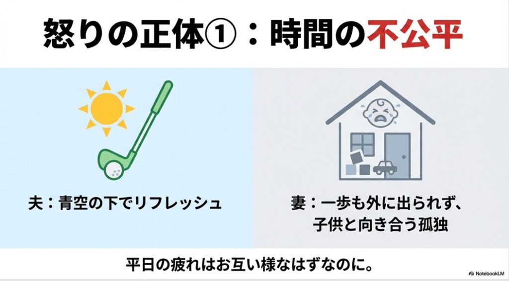 夫が青空の下でリフレッシュしている間、自分は家の中で子供と向き合い、一歩も外に出られないというコントラストが、強い不公平感を生むのです。