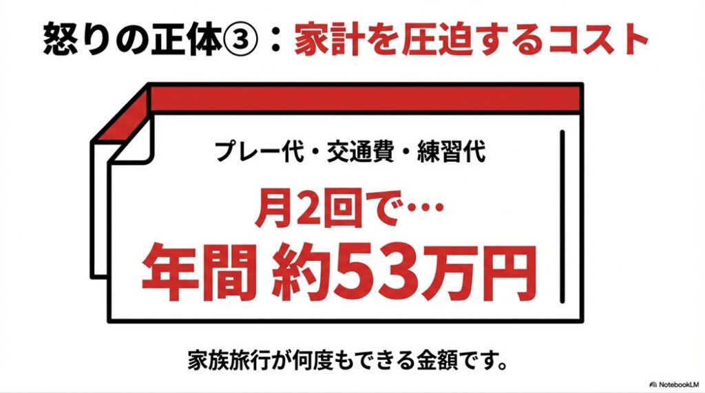 これが家計の余剰資金から出ているならまだしも、家族旅行や子供の教育資金を削って捻出されている場合、不満が爆発するのは当然です。