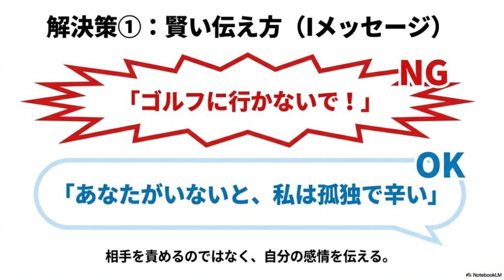 まずは自分の感情を主語にする「Iメッセージ」を活用しましょう。「あなたがゴルフでいないと、私は育児で孤立感を感じてとても辛い」と伝えるのです。