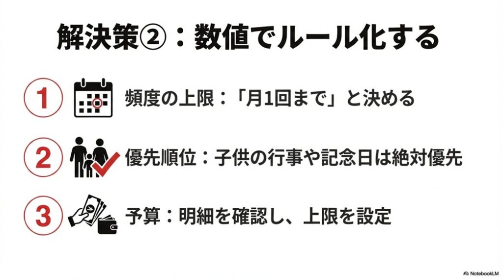 まずは現状の回数を把握し、家族の時間を確保するための「月の上限」を設定することが大切です。