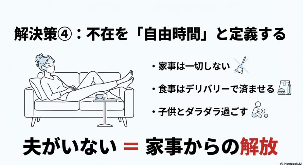 夫の不在を「自由の獲得」と再定義することで、むかつく感情は軽減されます。これは精神的な公平性を保つための賢い戦略です。