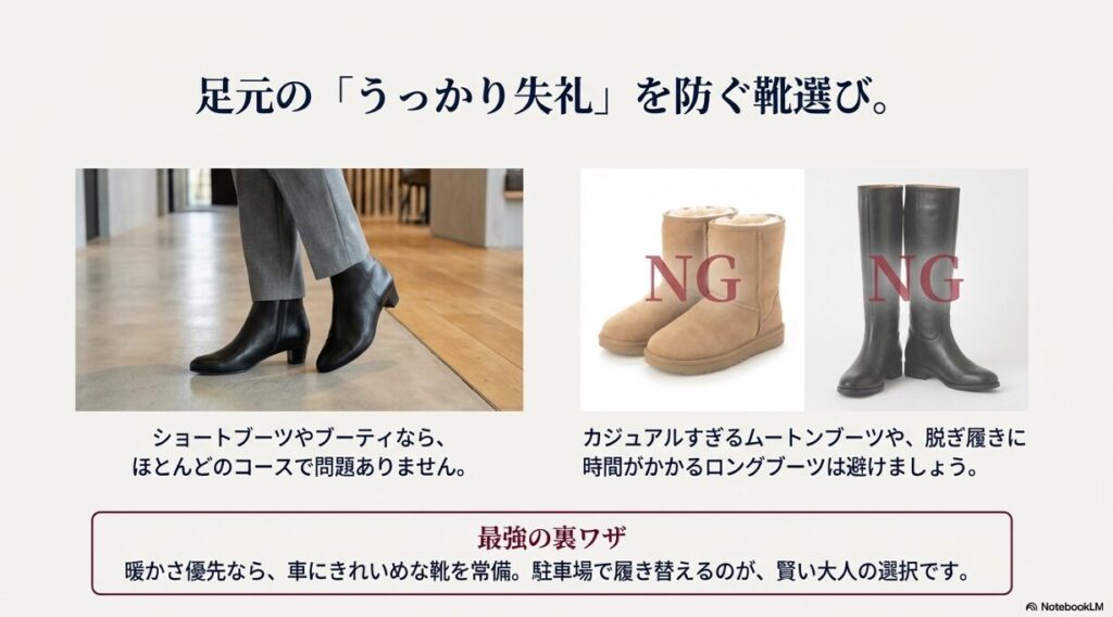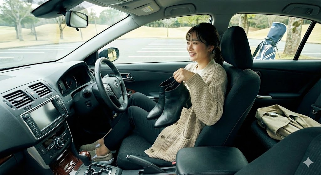 もしムートンブーツを履きたい場合は、車から降りる直前にパンプスやきれいめな靴に履き替えるのがスマートなゴルファーの知恵です。