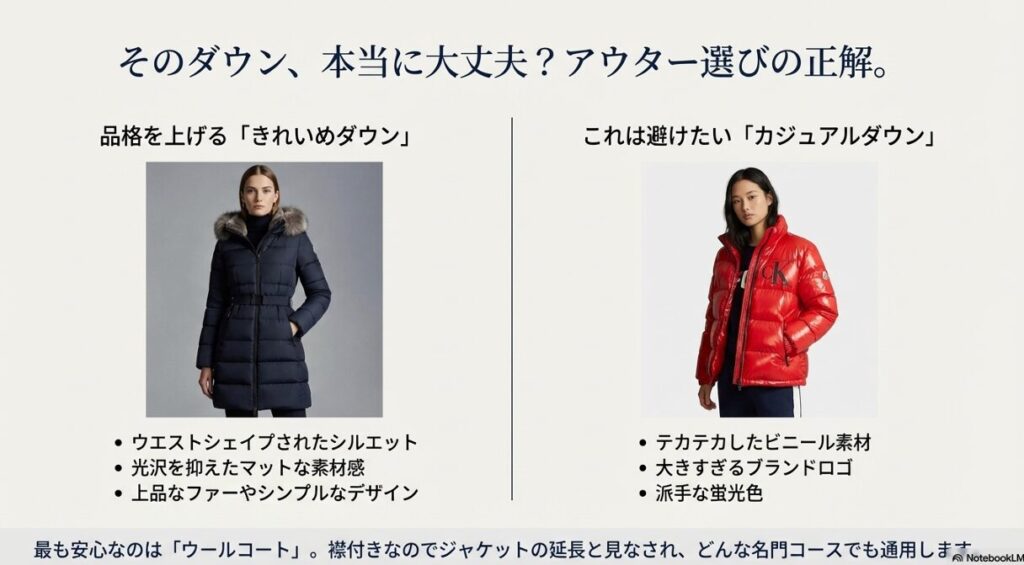 - OKなダウン: ウエストがシェイプされたデザイン、マットな素材感、ファー付きなど「きれいめ」なもの。