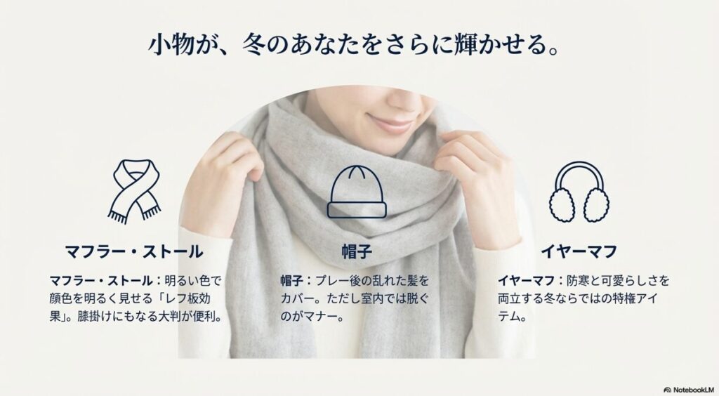 - マフラー・ストール: 顔周りに明るい色や柄を持ってくると、暗くなりがちな冬服が一気に華やかになります。大判ストールはレストランでの膝掛けにもなるので一枚あると便利です。