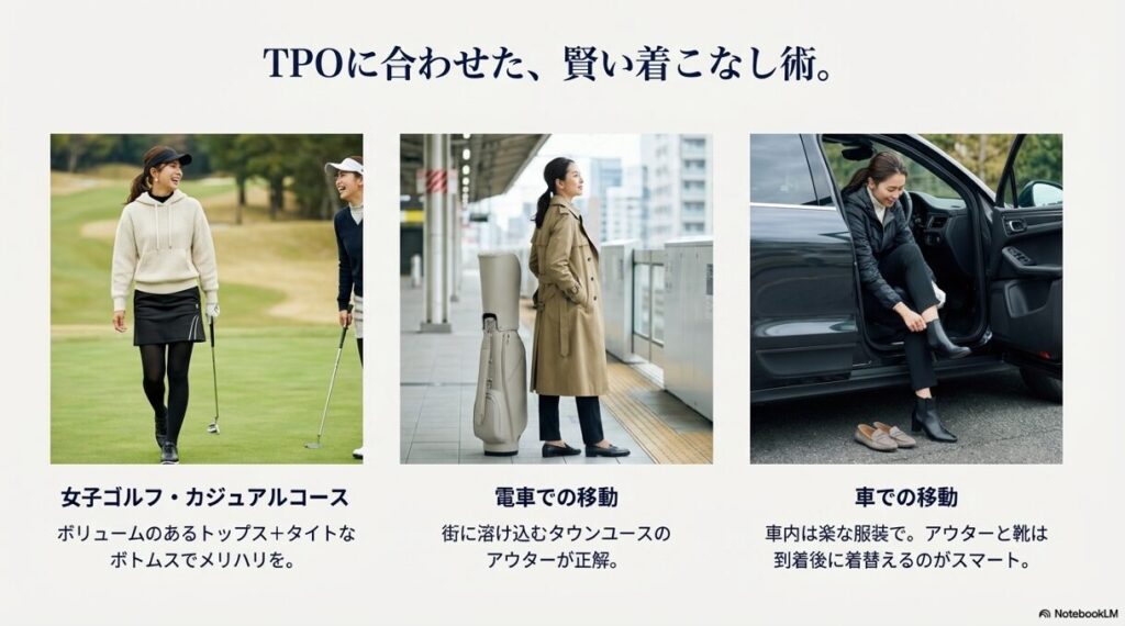 - 移動手段やコースの格式に合わせた具体的なコーデ例