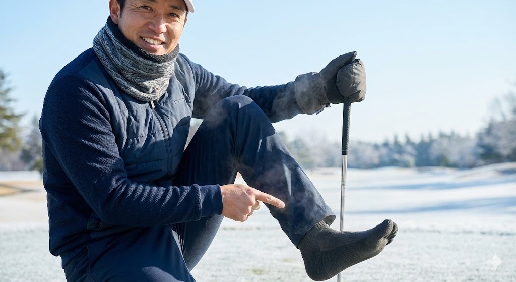 「足先が冷たくて感覚がない」というのは冬ゴルフあるあるですが、これを防ぐのが発熱素材のソックスです。