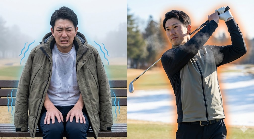 カートに乗って風に吹かれる待機時間(静)は極寒ですが、一度スイングを始めたり、傾斜地を歩いたりすれば(動)、真冬でも体温は急上昇し、汗をかきます。