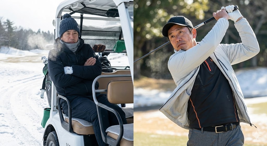 カートに乗って風に吹かれる待機時間(静)は極寒ですが、一度スイングを始めたり、傾斜地を歩いたりすれば(動)、真冬でも体温は急上昇し、汗をかきます。