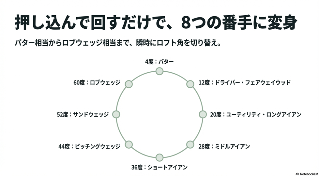 公式な情報によると、ロフト角をパター相当からロブウェッジ相当まで、合計8段階の設定が可能です。