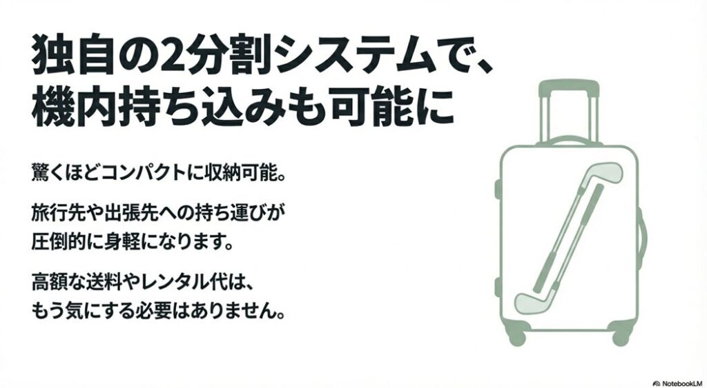 付属の専用ケースに入れれば飛行機の機内持ち込みバッグに収まるサイズになるため、旅先で「ちょっとだけゴルフをしたい」というときに、高額なバッグ送料やレンタル代を気にせず済むのは大きなメリットです。