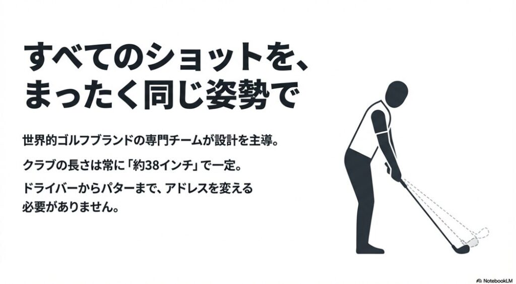 個人的には、すべてのショットを同じシャフト長(約38インチ)で打てるという点が非常に面白いと感じています。