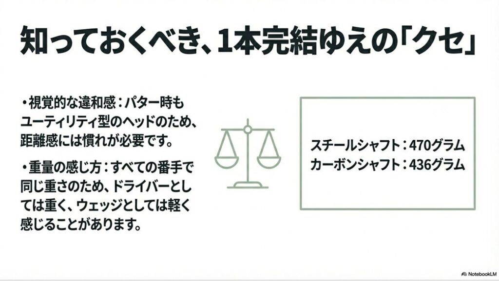 最も大きな壁は、すべての番手を同じユーティリティ型のヘッドでこなすことによる視覚的な違和感です。