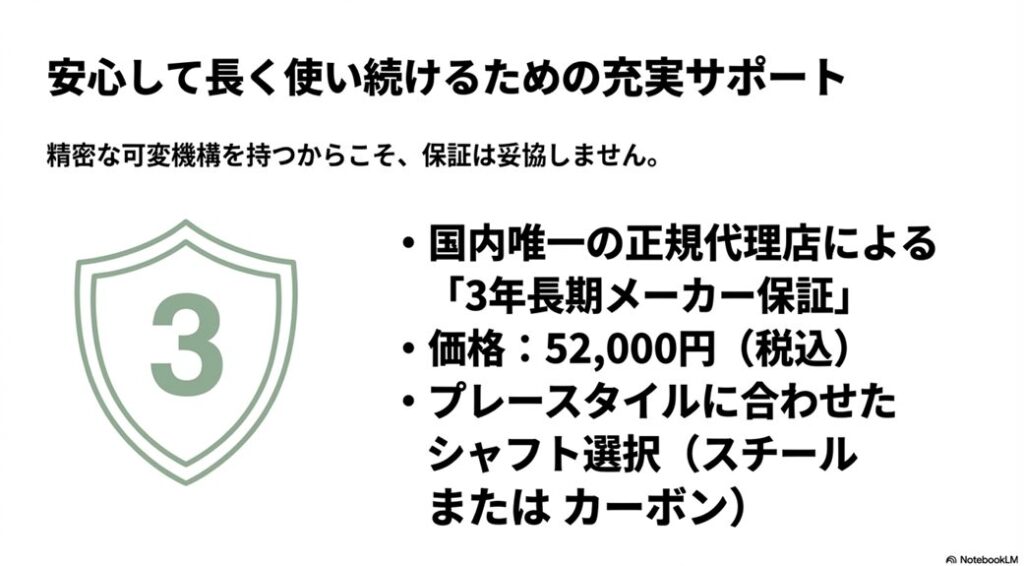 可変機構という精密なパーツを持つクラブだからこそ、保証の内容は見逃せません。