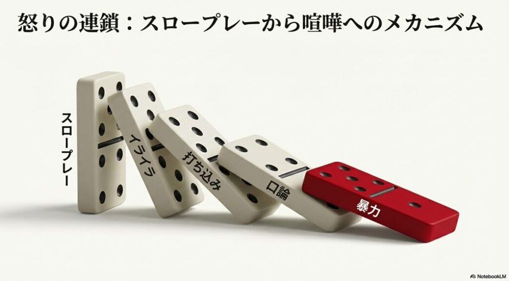 ここでは、なぜスロープレーがこれほどまでに人の感情を逆なでし、時には警察沙汰になるような喧嘩や危険な打ち込み行為にまで発展してしまうのか、その恐ろしいメカニズムとリスクについて深掘りしていきます。