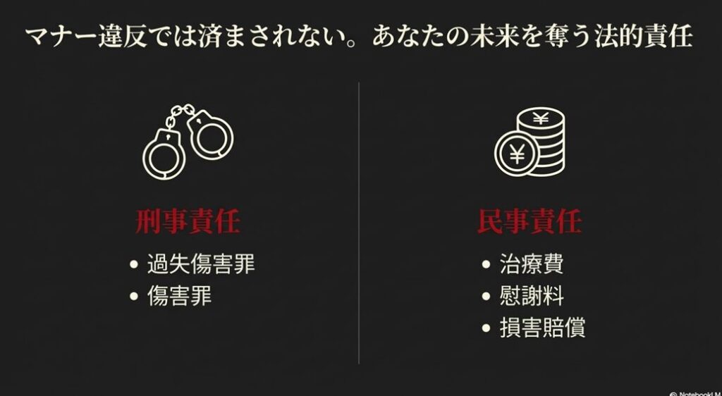 - 打ち込みによる怪我のリスクや最悪の場合に想定される法的責任(刑事・民事)