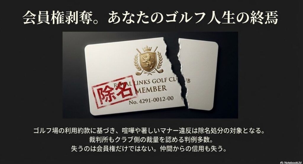 多くのゴルフ場の利用約款や会員規約には、秩序を乱す行為に対する厳格な処分規定が設けられています。