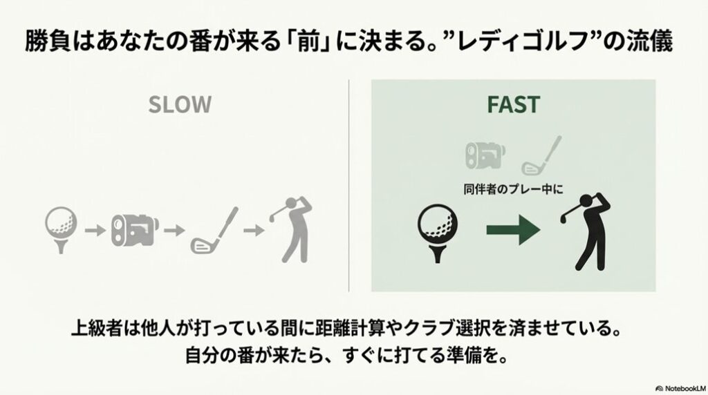 スロープレーの原因の多くは、移動速度ではなく、ボールの地点に到着してから打つまでの「準備時間」の長さにあります。