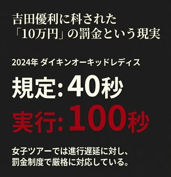 記憶に新しいところでは、2024年のダイキンオーキッドレディスにおいて、吉田優利選手に対してスロープレーによる罰金10万円が科されました。
