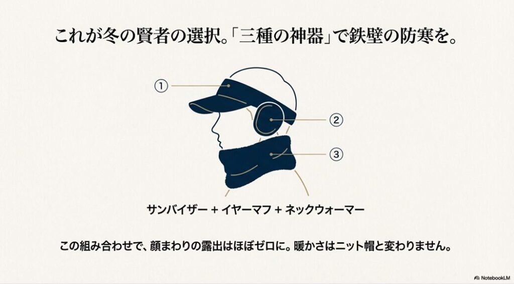 「サンバイザー + イヤーマフ + ネックウォーマー」。この3点セットがあれば、顔まわりの露出部分はほとんどなくなり、ニット帽を被っているのと変わらないくらいの暖かさを確保できます。