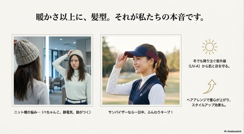 私たち女性ゴルファーが、寒さを押してでも冬にサンバイザーを選ぶ最大の理由。それはやはり「ヘアスタイルを維持できること」に尽きます。