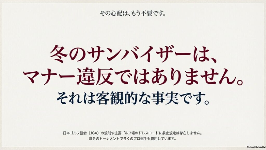 日本ゴルフ協会(JGA)の規則や、国内の多くのゴルフ場が定めるドレスコード(服装規定)を確認しても、「冬季におけるサンバイザーの着用禁止」といった規定は存在しません。