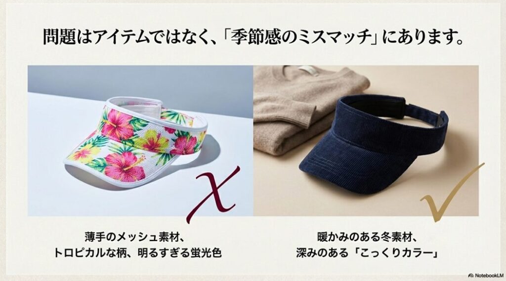 その原因は、サンバイザーというアイテムそのものではなく、「季節感のミスマッチ」にあります。